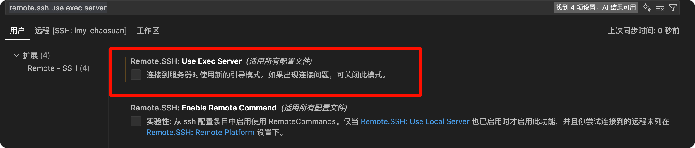 在连接到主机之前,VSCode 需要预先将设置 “remote.ssh.use exec server” 的勾选取消掉: