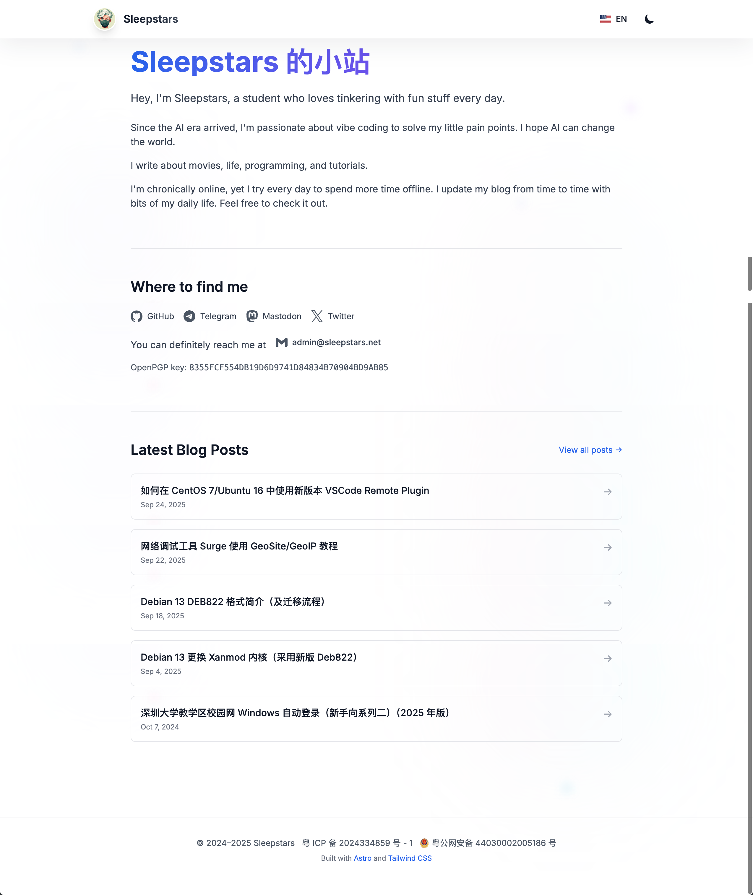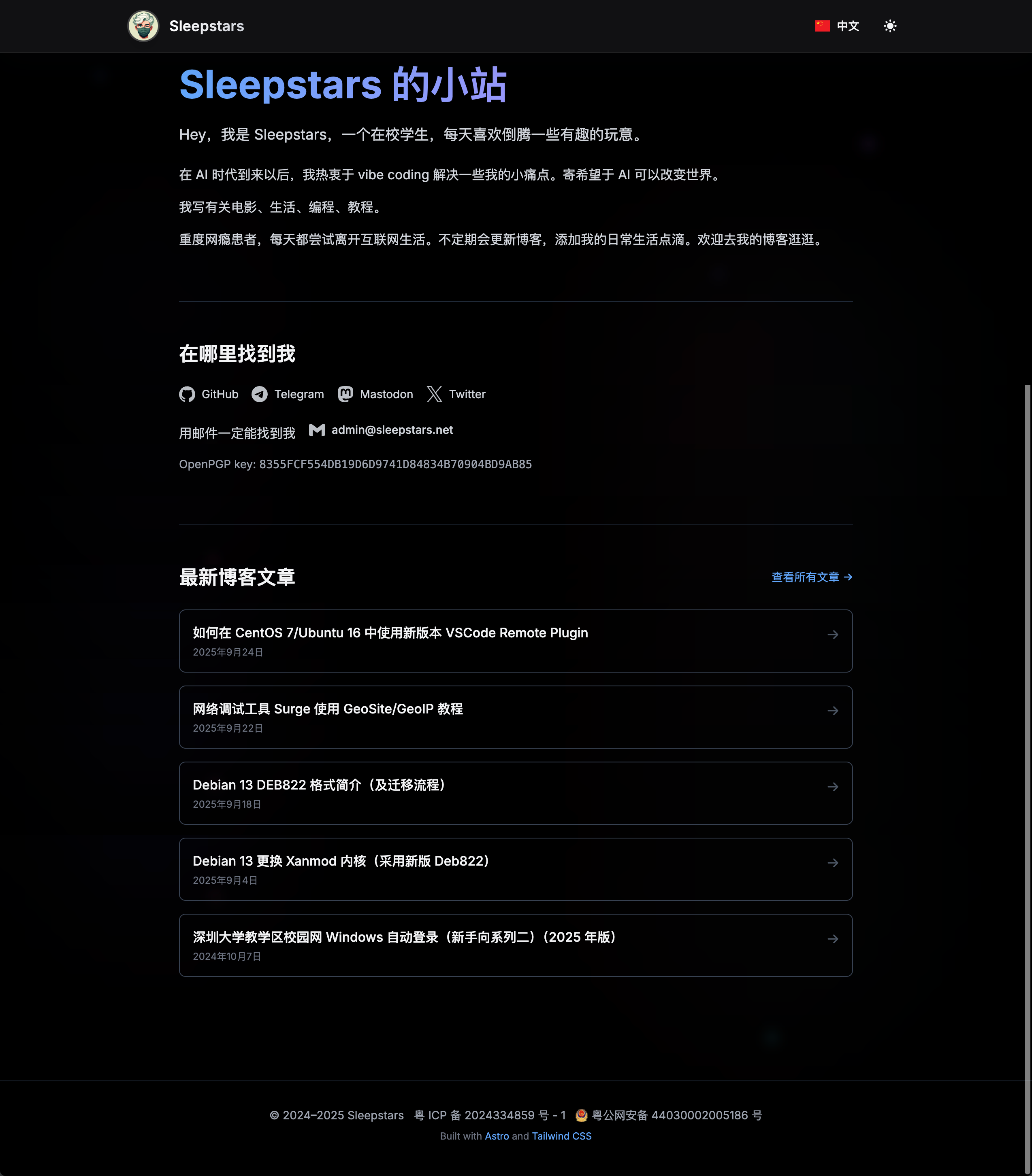 但是苦恼于自己一直没有前端开发能力,看到了 pseudoyu 大佬的首页又心痒难耐,最后决定照着大佬的界面,使用新的 Astro 架构创作一个新的支持多语言、支持深浅色自定义的个人主页。